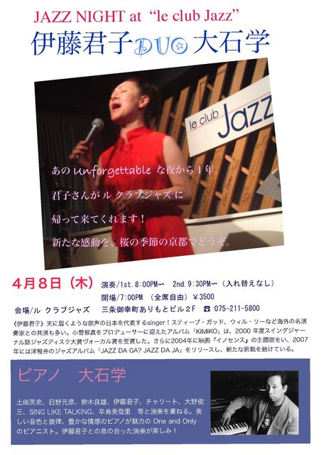 管理人さま: こちらの貴重な場をお借りして、素敵なコンサートのお知らせをさせていただいてよろしいでしょうか? ***** コミュの皆様: 神戸の小曽根ミュージックスクールで、伊藤君子さんに師事している「かいちょ」です。 今日は、私の住む京都に君子さんがいらっしゃって、とってもインティメートなライブをされるという、ご案内です。 桜の京都にぜひ、お越し下さいませ!よろしくお願いいたします。 ***** 昨年、伊藤君子さんと寺井豊さん、坂井紅介さんの、スペシャルコンサート”Unforgettable" を企画しました、