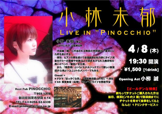 GOLDEN SATO PRESENTS 小林未郁 LIVE in "PINOKIO" コミュ↓ http://mixi.jp/view_community.pl?id=841631 「毒」/YouTube動画↓ 19:30open 20:00start \1,500[1drink] ※事前にチケットをご購入の方に限り、喫茶ピノキオ(2階)でチケットを見せ食事すると、さらに1ドリンク無料のサービス☆ OpeningAct 小柳 誠 加茂市レストパブ 「ピノキオ(3階)」で グランドピアノで奏でる 小林未郁の世界を お楽しみください☆ ■お問い合わせ■■■■■ レストパブ ピノキオ 〒959-1378 新潟県加茂市駅前