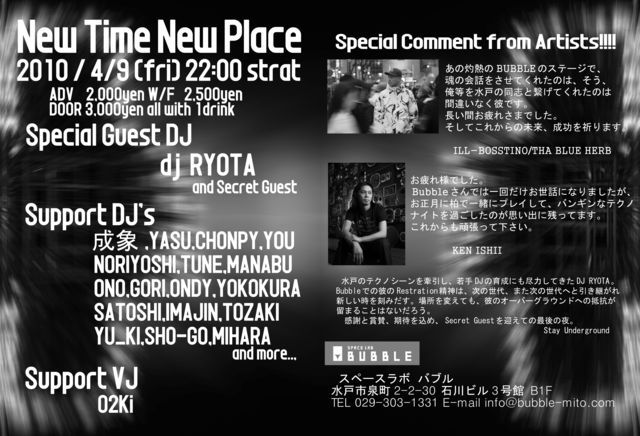 就きましてはRYOTAさんの歓送会としまして、Space Lab BUBBLEにて"New Time New Place"を開催いたします!!