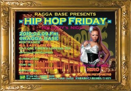 ☆Ragga base Presents☆ 『Hiphop Friday -Lady's Night-』 2010/4/9(FRI) @Ragga base ◆ENTRANCE:Lady's All Free!!!! Men's\1000(1D) <Special guest> ・Hiro fr.grine pixy < DJ > ・DJ Weed aka Tadashi ・DJ UKAWA ・DJ YOCO ・DJ DOG ・DJ TOGA ・DJ TOMITY <SOUND> ・SATO-C fr.Floss the movement ・自然防衛軍 <DeeJay & MC> ・Metal Gami ・Japonica ・Red <Support> ・Grine Pixy crew <Host> ・Skyhook