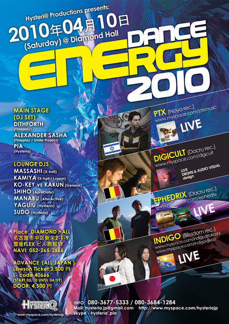Hysteri@ Productions presents: ■開催日時 2010年04月10日(土曜日) ■開催会場 DIAMOND HALL 名古屋市中区新栄2-1-9 雲竜FLEX ビル西館5F NAVI: 052-265-2666] ■開催時間 開場23:00 / 開演 23:00 **DANCE ENERGY 2010** Main Stage Artist: ** PTX (Noya rec.) israel LIVE** http://www.myspace.com/ptxmusic ** DIGICULT (Dacru rec.) belgium LIVE** http://www.myspace.com/digicult ** EPHEDRIX (Dacru rec.) belgium (LIVE** DRUMS & AUDIO VISUAL design)