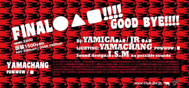 管理人様告知失礼いたします。 4/10(土) 11PM〜 ●▲■ -Final- ●▲■ DJz: YAMICA + JR LIGHTING: YAMACHANG SOUND DESGIN:ISM (NO POSSIBLE SOUNDZ) 仮装/1500yen, ADV/2000YEN, DOOR/2500YEN [ 問合せ先 ] オフィシャルサイトURL: CLUB JB'S (http://www.club-jbs.jp/) お問い合わせ:052-241-2234 052 EXPERIMENTAL PARTY ●▲■ MASS対CORE!!!!!KEEP IT REAL!!!!!変幻自在!!!!!世界中に散らばるCOREな魂との、無限大mix style。 名古屋地下道に対して、新たな激震を起こす様は、