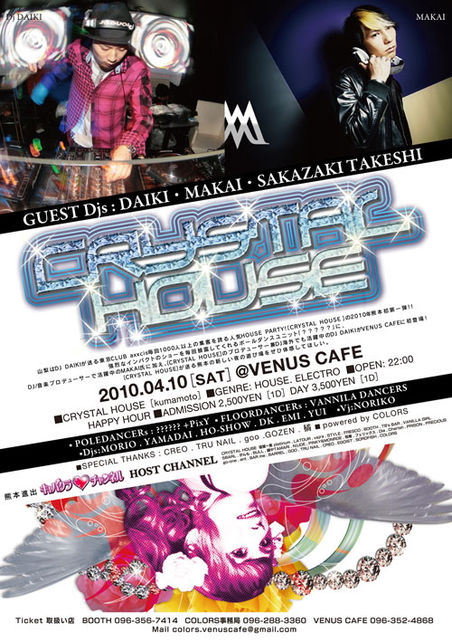 ■2010.04.10(SAT) @VENUS CAFE ■-CRYSTAL HOUSE ~kumamoto~ ■ GENRE: HOUSE. ELECTRO ■ OPEN: 22:00 ■ HAPPY HOUR : ■ ADMISSION: 2,500円(1d) DAY : 3500/(1d) ■ GUEST DJs: MAKAI . DAIKI.SAKAZAKI TAKESHI ■ POLEDANCERs: PIXY ■ DJs : MORIO.YAMADAI .HO-SHOW. DK. EMI . YUI ■ VJ :NORIKO ■ SPECIAL THANKS : CREO . TRU NAIL . goo .GOZEN橘、 ■ FLOORDANCERs: VANNILA DANCERS ■ produced by COLORS ---------------------------------------------------------- venus cafe : TEL .096-352-4868 熊本
