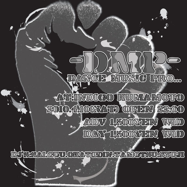 「DMP」@indigo Kumamoto 2010.04.10(sat) open 22:00〜 \1500 w/1drink ウェルカムテキーラ有り!!!!! DJ SAi,GUU,OKATHIN,Tamotsu,& Syuji from ゲス どーもみなさん、2ヶ月ぶりにDMPやります! 土曜開催でっす! 今回もSyujiくんの登場です! Syujiくん曰く「もうすぐ消えます。」ということなので、今回のDJが消える前のラストDJになるかもしれないんで、みなさん別れを告げに来てください! もちろんDMPレジデントDJ陣も気合い入れてDJしますんで、みなさん遊びましょー! いつも通りウェルカムテキーラも有り