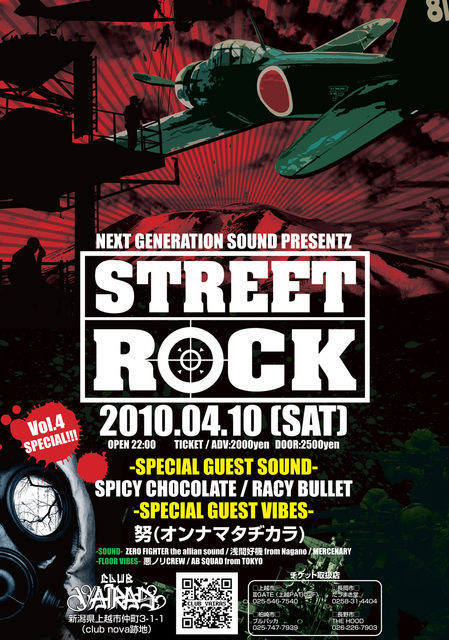 [STREET ROCK] Vol.4 SPECIAL!!! 2010.04.10 (SAT) @CLUB VAIRAS (旧club nova) 新潟県上越市仲町3-1-1 Open 22:00 前売り 2000円 当日 2500円 -SPECIAL GUEST SOUND- SPICY CHOCOLATE RACY BULLET -SPECIAL GUEST VIBES- 努(オンナマタヂカラ) -SOUND- ZERO FIGHTER the allian sound 浅間好機 from Nagano MERCENARY -FLOOR VIBES- 悪ノリCREW AB SQUAD from TOKYO CLUB VAIRAS携帯サイト http://28.xmbs.jp/clubvairas/ CLUB VAIRASコミュ