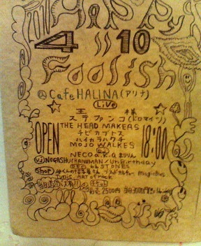 新潟アリナにてHAPPY=FOOLISH む〜たらずJUN君のオーガナイズイベントにチビカブトス出演します。 きっとやばい夜になるでしょう! お時間ある方はぜひおいでください。 濃密空間をシェアしましょう! ■2010年4月10日(SAT) 18:00〜 【 HAPPY=FOOLISH 】 会場: cafeHALINA (カフェ アリナ)@亀田 (亀田駅〜店舗間送迎バス有り) 前売り\2500(1drink付) 当日 \3000(1drink付) ◎イベント予約フォーム http://cafe-harina.jp/fmail/ LIVE ●王様 ●ステファンコ ●HEAD MAKERS ●チビカブトス ●ハ