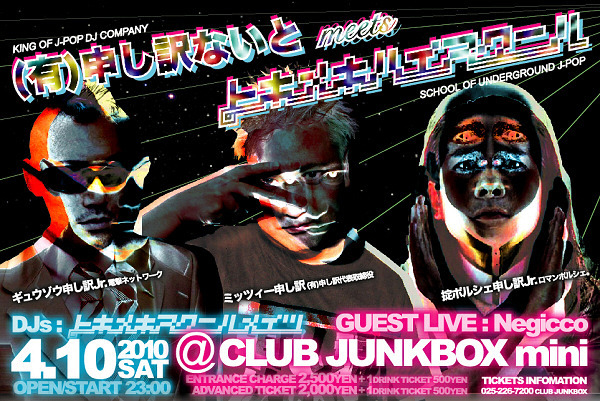 J-POPクラブイベントの告知をさせていただきます。 どうぞよろしくお願いいたします! 【新潟発!J-POPクラブイベント「トキメキ★ハイスクール」開催】 「トキメキ★ハイスクール」イベント公式HP http://sound.jp/tokisuku/ ♪♪♪♪♪♪♪♪♪♪♪♪♪♪♪♪♪♪♪♪♪♪♪♪♪♪♪♪♪♪♪♪♪♪♪ トキメキ★ハイスクール 7th Anniversary Special (有)申し訳ないと meets トキメキ★ハイスクール ■ 2010.04.10.SAT at CLUB JUNKBOX mini http://www.junkbox.co.jp/mini/ 新潟県新潟市中央区東
