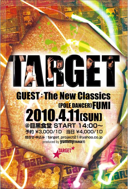 TARGET 〜プロジェクト発足10周年〜 4/11sun.14:00〜22:30 目黒食堂 http://www.meguroshokudo.com/ 予約:\3,000/1D 当日:\4,000/1D *16:00迄にご入場の方に限り再入場可能です。 問・申し込み:target_project21@yahoo.co.jp 必ず「4.11TARGETの件」と必ず件名明記下さい。 直接連絡のとれる方は出演者へお申し込み下さい。 GUEST TheNewClassics(LIVE&トークSHOW) http://www.thenewclassics.com FUMI(POLE DANCER) http://www.poledance.jp/profile_fumi.html PICK UP 汰椿 ht
