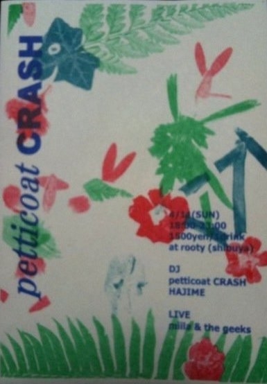 当イベントPLUGのレジデントDJでもある WIZZJONESくん主催のイベント "petticoat CRASH"いよいよ今週です! 【petticoat CRASH vol.8】 2010/4/11(sun) 18:00 - 23:00 add 1500yen (1 drink) DJ: petticoat CRASH with.... HAJIME (fabulous parade) live miila & the geeks at ROOTY(shibuya) http://www.club-rooty.com/ mixi community http://mixi.jp/view_community.pl?id=3787828