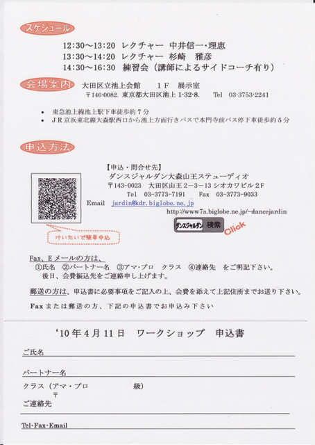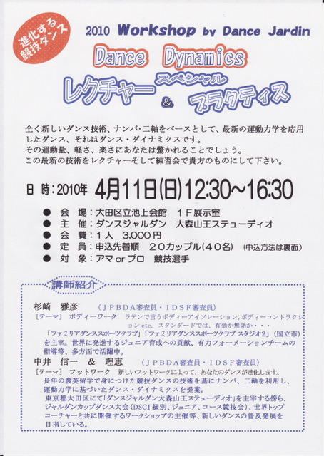 講談社のダンス雑誌『ダンスタイム』(3月発行予定)にダンスダイナミクスのレクチャーが掲載されることになりました。 本を見ただけでは理解しにくいことも有ると思います。 興味のある方、是非ワークショップにご参加下さい。 さらに今回は、杉崎雅彦先生がラテンとスタンダードの両サイドからダンスを考察するテーマでレクチャーをして下さいます。 レクチャーの後、レクチャー講師がサイドコーチする練習会を行います。練習会でレクチャー内容の実践を確認して下さい。 日時 2010年4月11日(日)12:30〜16:30 会場 大