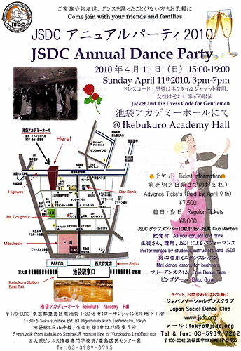 日時:2010年4月11日(日)15:00-19:00 会場: 池袋アカデミーホール http://www.academyhall.co.jp/index.php?%A5%DE%A5%C3%A5%D7 チケット: 前売り(二日前までのお支払い)7,500円 前日当日8,000円 飲食付き クラブメンバー10%off 内容: 年に一度のJSDCドレスアップパーティ♪ スペシャルデモンストレーションに楽しい企画。 いつもより少しおしゃれをして是非楽しんで下さい。 問い合わせ・ご予約はお気軽に tokyo@jsdc.org まで