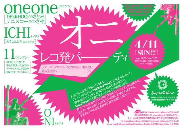 《ピカチュウではなくオニ情報の告知で申し訳ありません。》 実は、4/11日曜にオニのレコ発イベントがあります!!! 4/2の新譜「SUNWAVE HEART」のリリースを記念したイベントです!!! イベント詳細→ http://www.super-deluxe.com/2010/4/11/ 場所は、 東京は六本木の"スーパーデラックス"→ http://www.super-deluxe.com/ 共演者には、 ・"oneone"<DeerhoofのさとみとTenniscoatsのさやの2人組> → http://www.myspace.com/oneonejp ・"Ichi"<名古屋の1人楽団> → http://www.myspace.com/ichijapan ・田口史人[円盤]のバン