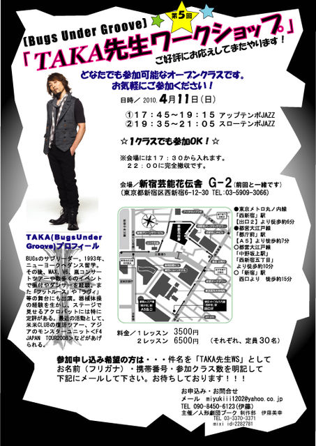 スペースお借りします。 またまた開催することとなりました。 第5回TAKA先生ワークショップ 日時/2010年4月11日(日) 1レッスン目 17:45〜19:15 アップテンポJAZZ 2レッスン目 19:35〜21:05 スローテンポJAZZ ※会場には17:30から入れます。 22:00に完全撤収です。 定員それぞれ30名 会場/新宿芸能花伝舎 G-2(別棟) http://www.geidankyo.or.jp/12kaden/08access/index.html 料金/1レッスン 3500円 2レッスン