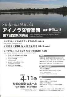 アイノラ交響楽団第7回定期演奏会 ジャン・シベリウス ラカスタヴァ 愛するもの 作品14 アーッレ・メリカント 交響詩 レンミンカイネン 日本初演 作品10 ジャン・シベリウス 交響組曲 レンミンカイネン 4つの伝説 作品22 主催 アイノラ交響楽団 後援 フィンランド大使館 社団法人日本フィンランド協会 日本シベリウス協会 NPO法人日本フィンランド文化友好協会 杉並区 お問い合わせ アイノラ交響楽団 info@ainola http://www.ainola.jp 全席自由 前売り1200円 (当日1500円) チケットぴあ(Pコ