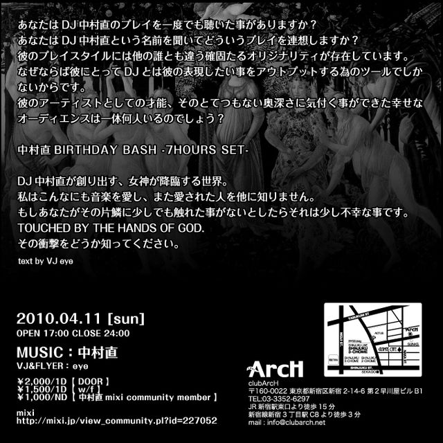 DJ暦30年目を迎える中村直のバースデイ・パーティです! 日曜の夕方5時から終電迄、7時間びっしり廻します! お友達お誘い合わせの上、沢山のご来場お待ちしてます! DJ 中村直 7 HOURS LONG SET 〜 Nao's Birthday Bush!!! 〜 2010.04.11.sun OPEN 17:00 - 24:00 DOOR: ¥2000/1D w/f: ¥1500/1D 中村直 mixiコミュニティメンバー特典 当コミュニティ参加メンバーの皆様は、 特別ディスカウント ¥1000でご優待致します!(ドリンクは別途お求めください) http://mixi.jp/view_community.pl?id=227052 ArcH 〒160-00