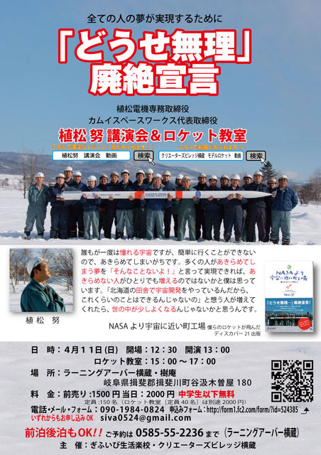 植松努講演会 in 樹庵 のお知らせ 4月11日に樹庵で植松努さんの講演会をさせていただきます。 「どうせ無理」廃絶宣言 誰もがあきらめてしまう夢、”宇宙ロケット”の開発事業に あえて挑戦している会社があります。 それが植松電機であり、 その専務取締役が植松努さんです。 なぜ宇宙ロケットに挑戦するのか? それは世の中から宇宙ロケットという夢を通して”どうせ無理”を無くすためです。 植松さんの話は衝撃的です。 誰もが暗黙のうちに正しいと考えていた価値観がガラガラと崩れます。 ”無理”と思っていた