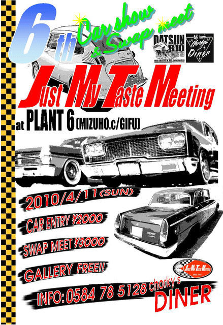 昨年、一昨年と諸事情により開催できませんでしたが今年は開催できる運びとなりました。 お誘い合わせの上、ご参加お待ちしております。 6th Just My Taste Meeting (ジャスト マイ テイスト ミーティング) 【日時】 2010年4月11日(日曜日) 午前9:00〜午後3:00 雨天決行 【場所】 岐阜県瑞穂市牛牧2836-1 スーパーセンター PLANT6 瑞穂店東駐車場 http://www.plant-co.jp/shop/shop15.html 【内容】 車両展示・スワップミート 関東・関西どちらからもアクセスしやすい岐阜県でオーナー同士の交流を深める ノ