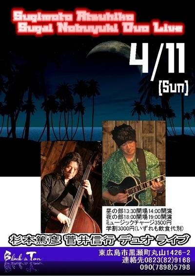皆さん、こんばんは〜 Black&Tan ママです。 ずーっと前から、思っていたことが、また、実現できます。 それは、 「杉本篤彦&菅井信行DUO」 実は、このお二人は、Black&Tan を始める前からのマイミクさんで、 広島市内でライブを聴きに行っていました。 お二人とも東京を拠点に活動されていらっしゃいます。 が、広島へはよく来てくださり、Black&Tan ができてからも、 それぞれに数回ライブをやっていただいています。 私の中で、いつかこのお二人のDuoで演奏してくれた
