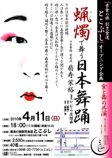 尾道の薬師通りから一つ中に入った所に小川小路があります。 その小路の中ほどにひっそりと佇む築100年とも言われています元遊郭だった建物がこのほど改築され、来る4月12日(月)素食の旅割烹食堂「とこぶし」としてオープンされることになりました。 この度、その前夜祭として「とこぶし」オープニング企画「食と舞の競演」が下記の通り開催されるそうです。 記 『蝋燭で舞う日本舞踊』 それは百年前の建物、 人は集いそこに喜怒哀楽と念が漂う空間が