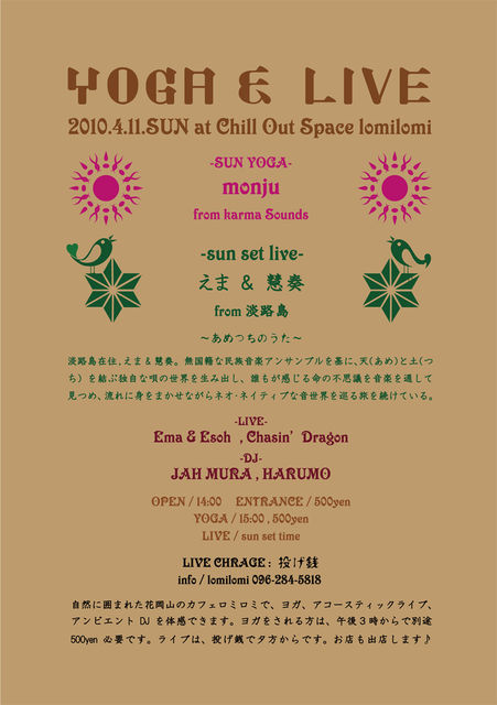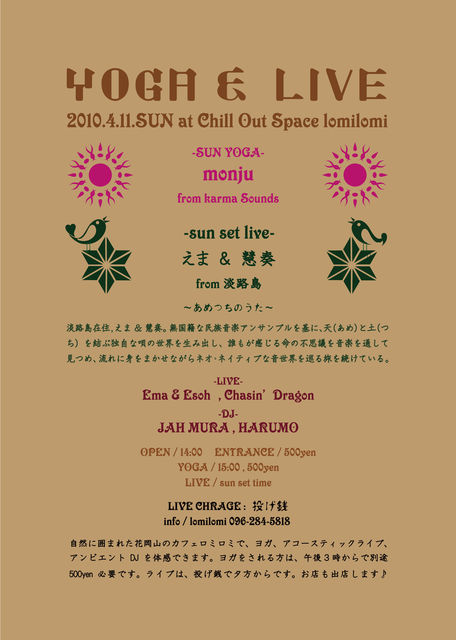 管理人様、告知失礼致します。 ♪YOGA & LIVE♪ -あめつちのうた- in kumamoto 2010.4.11.SUN at Chill Out Space lomilomi 自然に囲まれた花岡山のカフェロミロミで、ヨガ、アコースティックライブ、 アンビエントDJを体感できます。ヨガをされる方は、午後3時からで別途 500yen必要です。ライブは、投げ銭で夕方からです。お店も出店します♪ -SUN YOGA- monju (karmaSounds) -LIVE- えま & 慧奏 (from 淡路島) Chasin’Dragon -DJ- JAH MURA , HARUMO OPEN / 14:00 ENTRANCE / 500yen YOGA / 15: