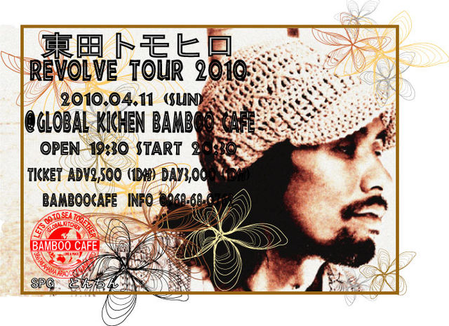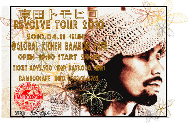 管理人様イベントの告知をお願いいたします。 東田トモヒロさんの全国ツアー (Revolve Tour 2010 in KUMAMO) @ GLOBAL KICHEN BAMBOO CAFE 2010.04.11(SUN) OPEN・19:30/START・20:30 TICKET 前売2,500 (1D付) 当日3,000 (1D付) bamboocafe 予 約&INFO・0968-68-0762 一年ぶりの東田トモヒロさんのLIVE楽しみです。 イベント告知ありがとうございました。