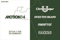 14回目を迎える「MOTION」。 今回の出演アーティストも豪華です!! お誘いあわせてぜひご来場下さい!! ide:realism Presents「MOTION 14」 2010年4月11日(日) @伊那GRAMHOUSE OPEN17:30 START18:00 ADV\2000 DOOR\2500 <ACT.> ■Chokesleeper(from神奈川) ■BUZZ THE BEARS(from大阪) ■MIMITTO(from東京) ■BLUE ENCOUNT(from東京) ■No.0012 <AGITAT DJ> ■101(LAF/ROCK TiES) チケット予約&お問い合わせ 0265-73-6923(伊那GRAMHOUSE)