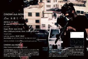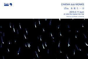 CINEMA dub MONKS Live. 永遠と一日 2010.4.11(sun) at cafe.the market mai mai Open 20:00 Start 20:30 Adv.\2500(1drink) Door.\3000(1drink) TICKET INFO. cafe.the market mai mai 岡山市北区問屋町14−101 K'sテラス1F TEL 086-241-3141 Special Support.B-SOUND ☆2010年 maimai 1st LiveはCINEMA dub MONKSです! maimaiオープニング当初、いつかこの人たちのライブを観てみたいと 憧れていたCINEMA dub MONKS。 今回B-SOUNDさんのサポートにより実現しました。 沈黙と暗闇から生まれる、心ふるわせる音