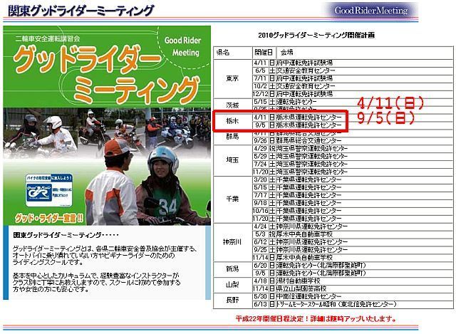まだ先の話ですが、2010年のグッドライダーミーティング(GRM)の開催計画が 発表されました! 栃木県は... 2010グッドライダーミーティング開催計画(http://www.mfk.jp/g_rm/top.html) 4/11(日) 栃木県運転免許センター 9/5(日)栃木県運転免許センター の2回だそうです。 自分は参加できる日は参加しています 良かったら一緒にスキルアップしてみませんか? 講習費用は保険の100円だけですww 何より免許センターのコースを走れるのが嬉しいw そんな感じですねw 集合:鹿沼IC近くのファミリーマー