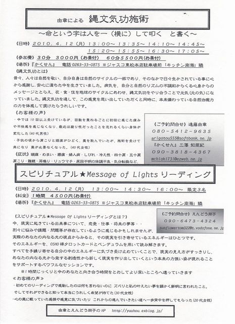 主催者のちあきさんからの案内を以下に記します。 長い冬も終わり草花の芽吹きに、そして松本でも桜の開花を直前に春の訪れを感じる今日この頃です 4月12日(月曜日)、「かくせん」にて行いますイベントのお知らせです 今回は八坂村在住の素敵なご夫婦「由朋」の初登場です 音楽活動以外のそれぞれのセッションを体験していだけます 夕方からは持ち寄り夕食会+ミニライブです 今回も当店で扱っている「Synagy Water」、「METRIC」などでお馴染みのライディックの中尾さんと中込さんがいらっしゃいます。 「自分力」を高めること以外にもお水や