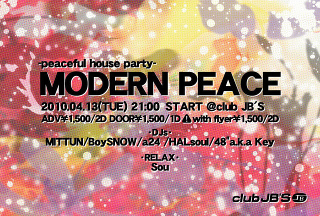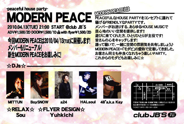 今回のMODERN PEACEは2010/4/13(TUE)に開催します! 心機一転メンバーも新しくなりました。 みんなモチベーションも高いし、色んなコトを試していけると思います… ボクも楽しみで仕方ないっす! HOUSEを中心にPROGRESSIVE HOUSEのパーティーです!! 平日の開催ですが、毎回盛り上がっています! とてもフレンドリーなので、誰でも仲良くなれますよ☆ 今回、今までのモダピの写真を集めたオリジナル写真集も放映予定です! 編集が間に合えばですが… DJの名前を言っていただくか、フライヤーを持ってきていただければ、 前売り料