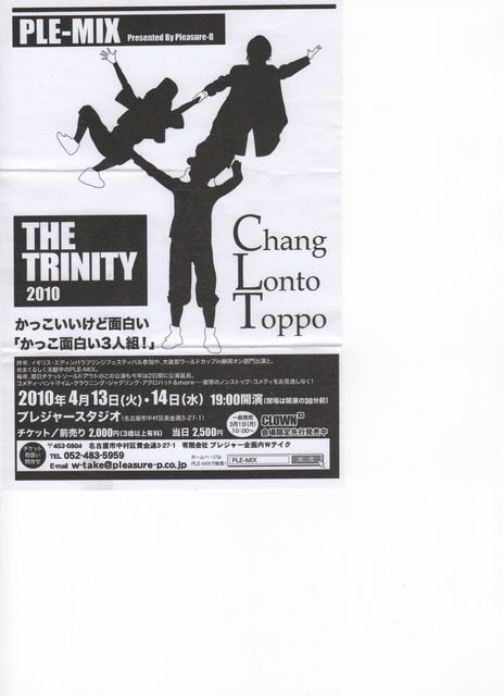 今年もこの時期が来ましたね^^ 毎年、即日チケットソールドアウトの人気公演が今年は2日間!! コメディ・パントマイム・クラウニング・ジャグリング・アクロバットなど、【かっこいいけど面白い3人組】を観に行きましょう! 日時:4/13(火)、14(水) 19:00〜 会場:プレジャースタジオ 1F 料金:前売¥2,000(3歳以上有料) 当日¥2、500 ※一般発売 3/1(月)10:00〜 【チケット取扱・お問い合わせ】 プレジャー企画内Wテイク TEL 052−483−5959