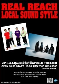 open 18:30 / start 19:00 * adv 2,500yen / door 3,000yen 出演:REAL REACH / LOCAL SOUND STYLE チケット発売中 チケットぴあ 0570-02-9999 P:100-396 ローソンチケット 0570-084-004 L:40591 イープラス http://eplus.jp Jail HOUSE 052-936-6041