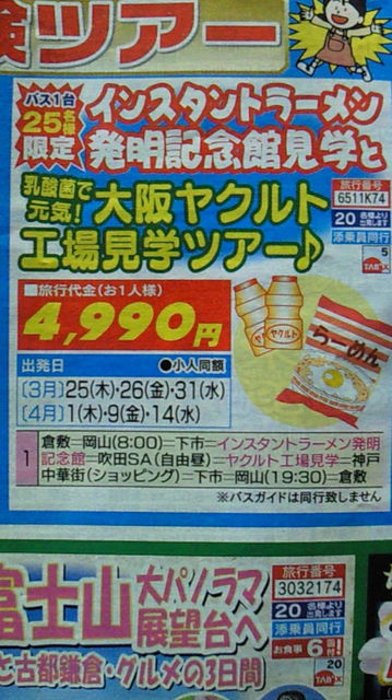 みなさま、初めまして\(^▽^)/ 管理人様より貴重なスペースをいただきます とっても突然なお話ですが… 4月14日に行われる日帰りバス旅行に行ってみませんか 今のところ最少人数20人に足りず… 日帰り旅行が好きなアナタ お友達を誘ってみてはどうですか?? たまにはこんな旅はいかがでしょうか?? 一緒に楽しみましょう♪ 大人になっても工場見学に行ってみたいじゃないですか ぜひぜひ一緒に行ってみましょう 旅行会社の関係もあるので 気になる人、詳しく知りたい