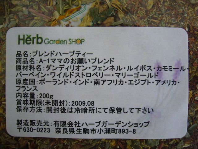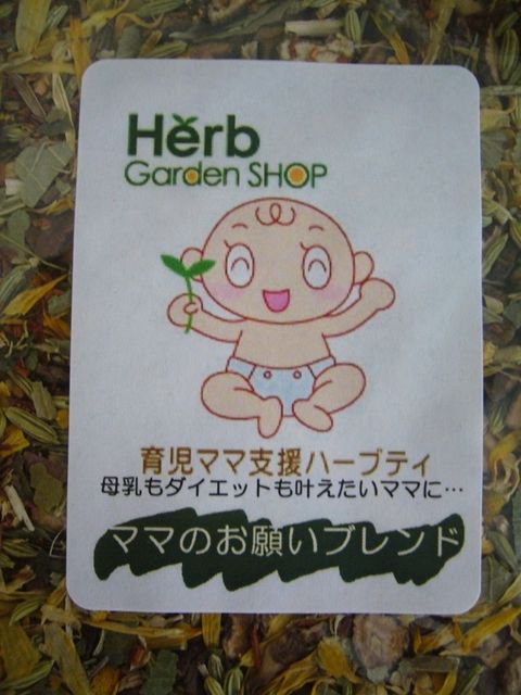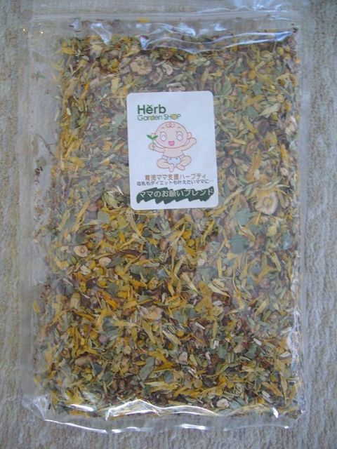 母乳育児支援ハーブ専門店【Herb Garden SHOP】のハーブティ ママのお願いブレンド(200g)です。 サイトからの転載です↓ ・母乳も出ないし、産後なかなか体重も減らないなと悩んでいるママのお願いに答えたブレンドです。 ・母乳の出を促しつつ老廃物を排出してくれると好評のハーブをブレンドし、ミネラルの補給も目指しています。 賞味期限は2009年8月で、主なブレンドは下記の通りです。 バーベイン・フェンネル(有機原料使用)・ダンディリオン・ワイルドストロベリー・ マリーゴールド・ジャーマンカモミール・ルイボス(ECOCERT認