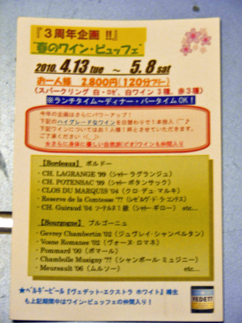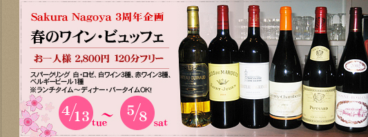 (一部、最終の案内情報に更新されています=★。最後まで読んでね) コミュのメンバーの瑞杞さんオススメのお店「サクラナゴヤ」で、 「ワイン・ビュッフェ」(飲み放題!)が行われます。 (お店はこちら⇒http://www.sakura-nagoya.jp/index.html ) 瑞杞さんと私(ぽんきち)は、4月14日(水)か15日(木)に行く予定ですが、 よろしかったら、ご一緒しませんか? ☆4月11日(日)まで、同行者募集中 ☆同行いただける方は、 14日(水)か15日(木)か、どちらの日に行