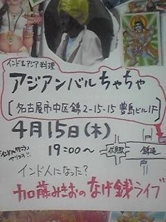 4月15日(木)名古屋の錦(インド料理屋アジアンバルちゃちゃ。) http://lunch.xtone.jp/archives/asia-chacha.html 投げ銭(無料)ライブ 19時から やります! インド人ネタでやります。ぜひお越しください 加藤みきお⇒ボードビリアン 大道芸人が本職ですが 時には、舞台役者 時には、コラムニスト 時には娼婦のようにASAKO 時にはインド人 と言うことで インド店なんでインド人になりきってやります。 下記 前回のアジアンバルちゃちゃのライブの様子 http://www.gakuenblog.com/katomikio/date/2009/12/3