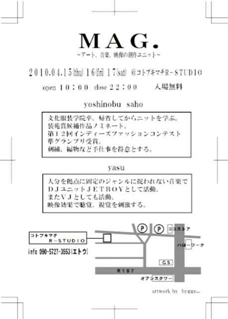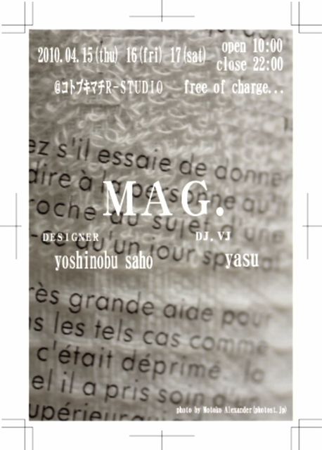 お知らせ。 友人と個展します。 『MAG.』 4/15、16、17 @コトブキマチR-STUDIO。 10:00〜22:00 お時間がありましたら、是非お越し下さい。