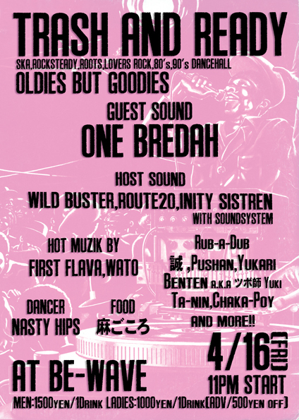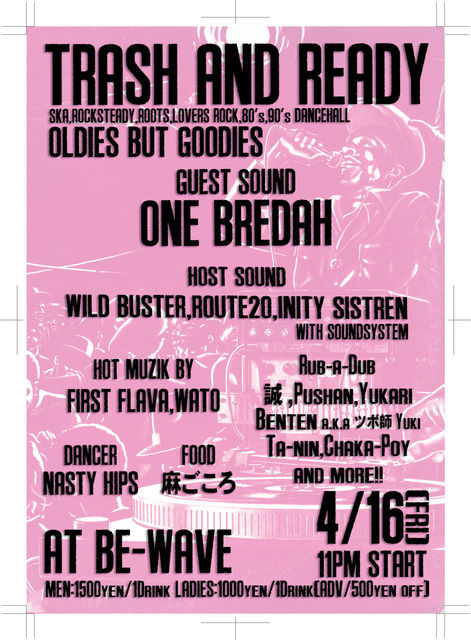 4/16(金) @新宿BE-WAVE 『TRASH AND READY』 〜Ska,RockStedy,Roots,Lovers Rock,80's,90's Dancehall〜 〜TRASH AND READY〜 2010年3月よりスタートしたREGULAR DANCE!! 若手のWILD BUSTER, ROUTE20, INITY SISTRENの3 SOUNDが毎回GUESTを迎えてお贈りし、RECORDだけのPLAYスタイルで60's〜90'sのFOUNDATION DANCE!! REGGAE MUSICの奥深さやRECORDの温もりを感じて頂けるDANCEとなっております、是非早い時間からお楽しみ下さい!! 4月のGUESTは横浜からONE BREDAHを迎えてのDANCEHALL NIGHT!!!! さらに今回は偶数月な