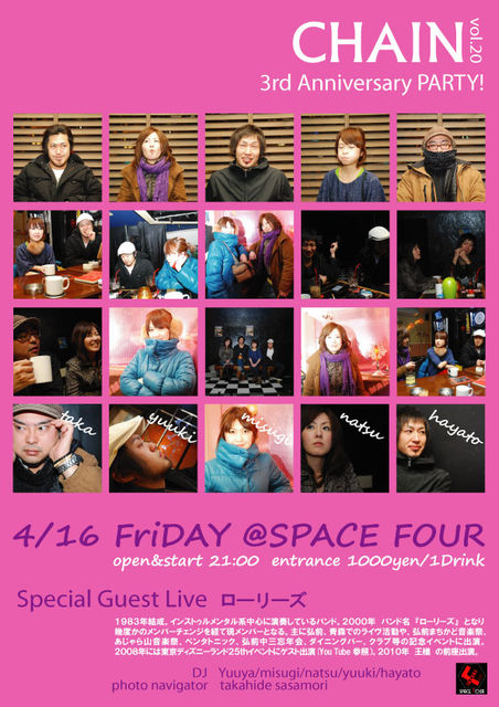 告知失礼いたします!! ★4月16日(金曜日) 『chain 3rd Anniversary』 @SPACE FOUR ☆open&start 21:00 ☆entrance 1000円/1ドリンク付 ★Special Guest Live ローリーズ 1983年結成。インストゥルメンタル系中心に演奏しているバンド。2000年 バンド名 『ローリーズ』 となり 幾度かのメンバーチェンジを経て現メンバーとなる。主に弘前、青森でのライヴ活動や、弘前まちかど音楽祭、 あじゃら山音楽祭、ペンタトニック、弘前中三忘年会、ダイニングバー、クラブ等の記念イベントに出演。 2008年には