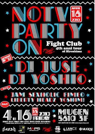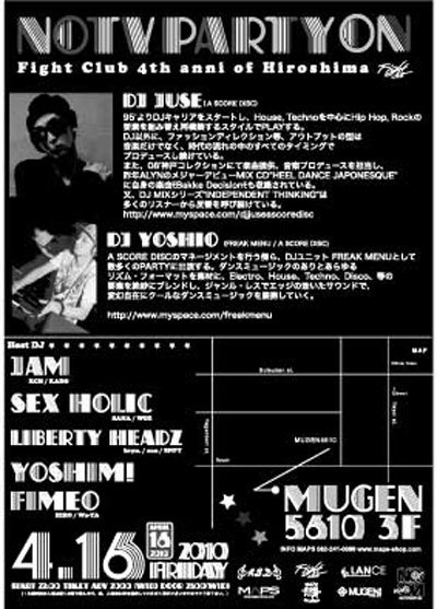 4/16(FRI) "NOtv PARTYon" FightClub 4th Anni PARTY @ MUGEN 3F SP Guest DJ JUSE 95’よりDJキャリアをスタートし、House, Technoを中心にHip Hop, Rockの 要素を組み替え再構築するスタイルでPLAYする。 DJ以外に、ファッションディレクション等、アウトプットの型は 音楽だけでなく、時代の流れの中のすべてのタイミングで プロデュースし続けている。 また、08’神戸コレクションにて楽曲提供、音楽プロデュースを担当し、 昨年ALYNのメジャーデビューMIX CD” HEEL DANCE JAPONESQUE” に自身の楽曲”Bakke Decisio