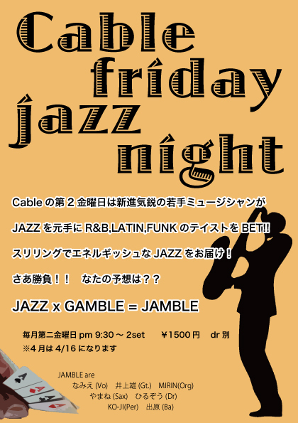 金曜日 空模様:晴れ 気温:最高15° こんな素敵なお天気、皆さんのご予定はお決まりですか? Cableはこの日、 誰もが気軽に立ち寄れる 「エネルギッシュなジャズ」を触れることがでる ちょっとお洒落なジャズイベントを行います 若手奏者達がジャズをベースに、 そして更に岡山からプロ・オルガニスト”MIRIN”を迎え、 R&B、ラテン、ボサノバ、ファンクのテイストを加えたサウンドでCableを席巻する! もちろん おいしいお酒や音楽をつまみながら ゴージャスでリッチな雰囲気