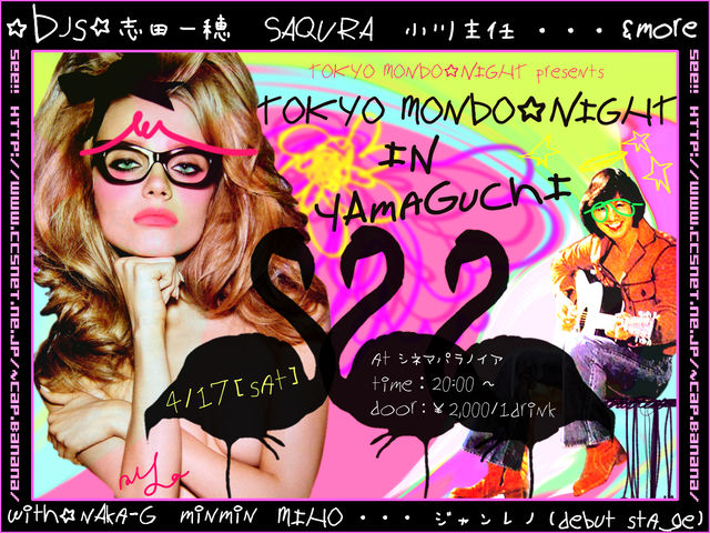 オールジャンルで大騒ぎ☆東京一のお騒がせDJたちがいきなり山口県へ強行突入!! 歌謡曲、ロック&POPS、サントラにアニソン、レアグルーヴから演歌まで、 騒げる曲ならとにもかくにもなんでもござれ。 目撃せよ、これが近未来TOKYOモンドDJらのビックリイベントだ!!! 待ち合わせは、山口DE!!!! 4/17(土) at シネマパラノイア4/17[sat] 20:00〜 cheaper01 20:20〜 MIHO 21:00〜 ジャンレノ(debut stage) 21:40〜 minmin 22:20〜 K.K 23:00〜 小川主任 23:40〜 YAMACHAN 24:20〜 SAQURA 25:00〜 志田一穂 25:40〜