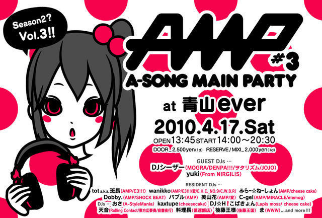 Anime(A-song) Main Party = AMP = 増幅器 皆で楽しんでHAPPYな気持ちを増幅させよう!! 10月にスタートし、12月に2回目を開催したNEW STYLE PARTY "AMP" 初回はmixiのみでの募集にも関わらず満員御礼!!! 2回目も100人を超える参加者に来ていただき大盛況の内に終了しました。 そのAMPが再び青山CLUB "ever"に登場!! Partyを彩るDJは前回Partyを盛り上げたレギュラー陣は勿論、 前回Guest DJとして参加したDJシーザーが再降臨! そして、NIRGILISのDrのyukiさんがDJとして参加!!! その他にも様々な人