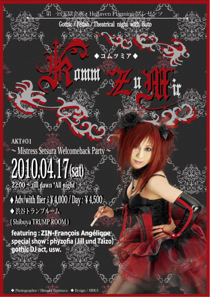 マダムエドワルダ、そしてZin様ファンの皆様、 貴重なスペースをお借りして告知させていただきますm(__)m ■ Komm Zu Mir (コムツミア) 〜 Mistress Setsura Welcomeback party 〜 ◆日時 : 2010/04/17(sat) 22:00〜till dawn ( all night ) ◆場所 : 渋谷トランプルーム 新規オープン白の間も含め全館貸切のゴージャス感を味わってください。 ◆入場料 : 予約/フライヤー持参\4000,当日\4500 ◆DJタイム:赤の間/黒の間、上下同時スピン! ゴシック〜フェティッシュ系の人気DJ、総勢6名。 お客様には好みの