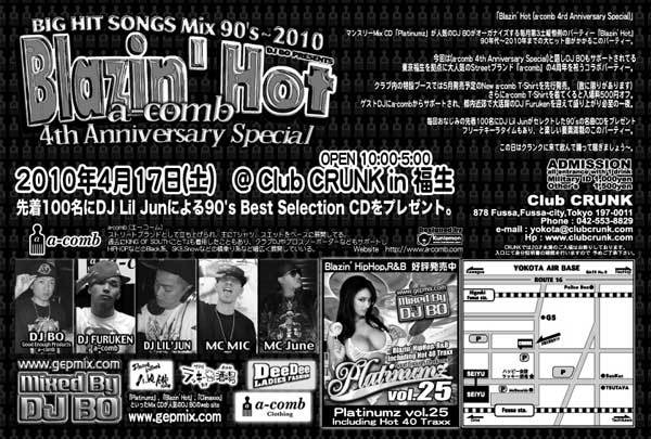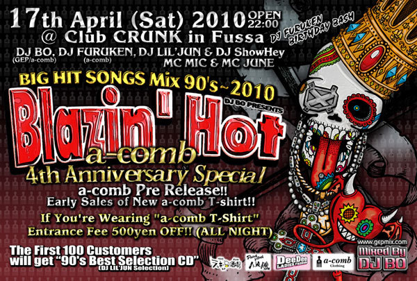 DJ BOがオーガナイズする第3土曜恒例のパーティー「Blazin' Hot」 90年代〜2010年までの大ヒット曲がメインにかかるこのパーティー。 今回は(a-comb 4th Anniversary Special)と題し、DJ BOもサポートされてる東京福生を拠点に大人気のStreetブランド『a-comb』の4周年を祝うコラボパーティー この日はクラブ内の特設ブースで5月発売予定のNew a-comb T-Shirtを先行発売。 (数に限りがあります) ゲストDJにa-combからサポートされ、都内近郊で活躍中のDJ Furukenを迎えて盛り上がり必至の一夜 そしてa-comb Tシャツ
