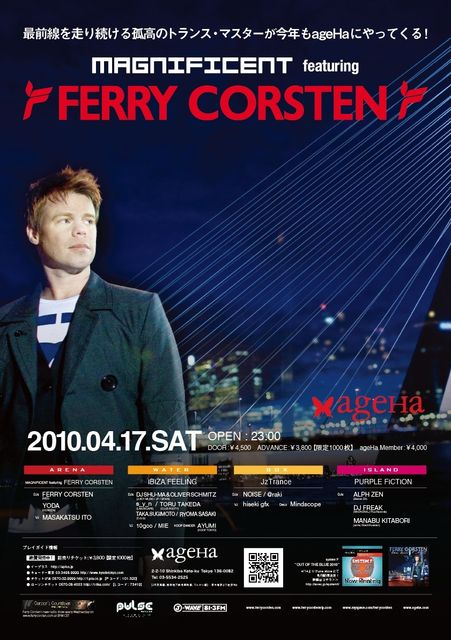 スーパー・ハイクオリティー・パーティー、MAGNIFICENTの記念すべき2010年初陣は、エレクトロニックダンスミュージック界の先駆者、Ferry Corstenが登場! トランスの枠に収まりきらない、メロディアスかつエネルギッシュなサウンドでフロアーに興奮を届けてくれる彼に今年も期待大だ!! 【MAGNIFICENT featuring FERRY CORSTEN】 2010.04.17 (土) ageHa@STUDIO COAST OPEN 23:00 DOOR:¥4,500 ageHa MEMBER:¥4,000 ADVANCE:¥3,800【限定1000枚】 ☆ 前売りチケット情報絶賛発売中 ☆ ローソンチケット(Lコー