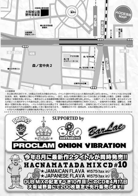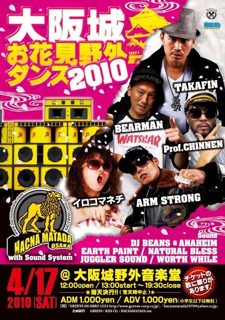 [大阪城お花見野外ダンス2010] 2010年4月17日(土) 12:00 OPEN 13:00 START 19:30 close 前売り1000円 当日1000円 @大阪城野外音楽堂 GUEST ARTISTS TAKAFIN BEARMAN Prof.CHINNEN IROKOMANECHI ARM STRONG SOUND DJ BEANS&ANAHEIM EARTH PAINT NATURAL BLESS JUGGLER SOUND HACNAMATADA with SOUNDSYSTEM 【問】 GREENS 06-6882-1224 http://www.greens-corp.co.jp/ hacnamatada1974@yahoo.co.jp 企画制作 GREENS / KISS CO. / HACNAMATADA ent HACNAMATADA HP htt