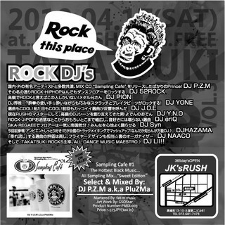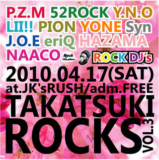 ---------------------- TAKATSUKI ROCKS VOL.3 2010.04.17(SAT) at.JK'sRUSH/入場無料!! START 21:00〜5:00 ---------------------- DJ's P.Z.M 52ROCK Y.N.O LII!! PION YONE Syn J.O.E eriQ HAZAMA NAACO のメンバーでお贈りします♪♪ さらに、今回もフランクフルト1本200円で屋台もあり! 春の陽気に、これはもう皆さん一緒にスプリングロックするしかないでしょー(^O^) ロックTなんか着ちゃって来て下さい◎ お待ちしてます★