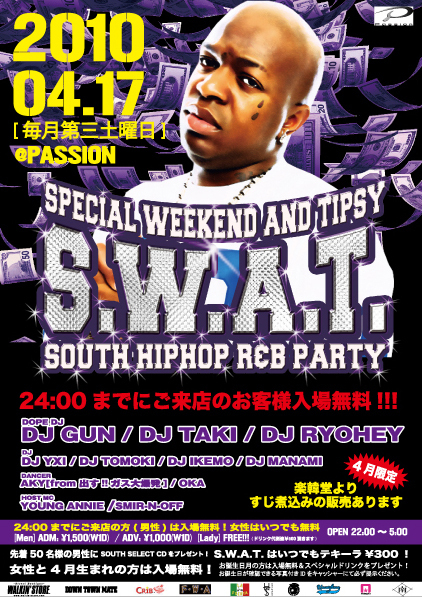 よっしゃーーーーー!!!!!! 新年度4月がやってきたぜーーーーーーー!!!!!!!! 春だーーーーーーー春1番だーーーーーーーーー!!!!!!!!!! サイクローーーーーーーン!!!!!!!!!! て事で 新社会人応援企画!!早割りSWAT開催決定! 新社会人のミナサマ・・・ だけじゃなく!サウス好きならドドンと来やがれ! ドドンと暴れまくりやがれ!!! 今年も起こすぜSOUTHの台風ーーーン♪♪♪ 4月は特別に! 男性も12時まではエントランスフリーにしちゃいます!! (*入