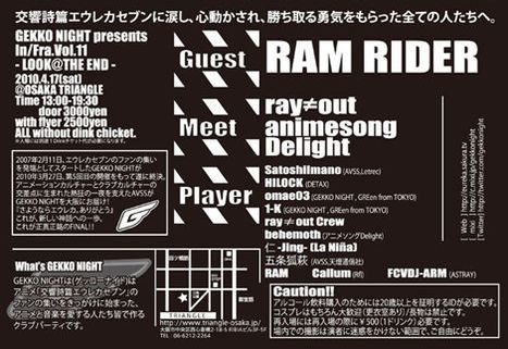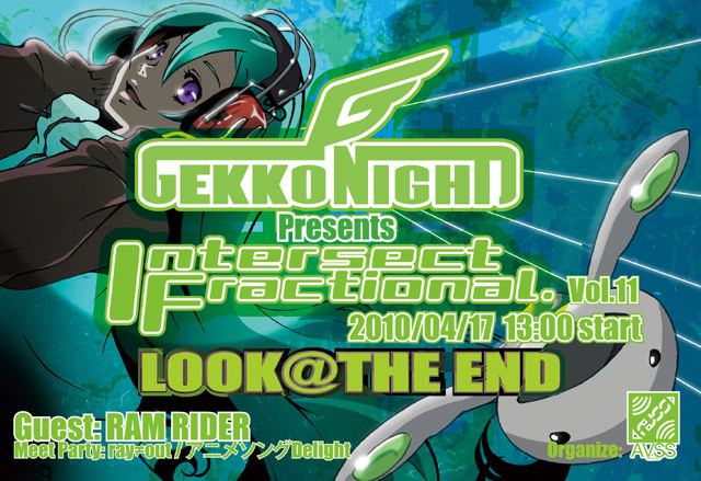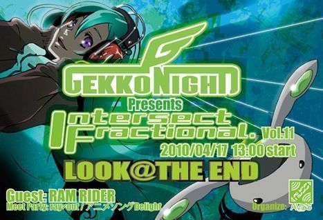 みなさん、お久しぶりです!管理人の☆Kazuです! ついに!大阪にもエウレカセブンの、あのパーティーがやってきます!!!! ///////////////////////////////////////////////////////////////////////////// GEKKO NIGHT presents 『Intersect Fractional. Vol.11』 ///////////////////////////////////////////////////////////////////////////// 日時:4/17<sat> 13:00~19:30 場所:心斎橋 club TRIANGLE (http://www.triangle-osaka.jp/) 料金:一般 3,000円 フライヤー/前売り 2,500円 ※入場時に別途1drinkチ